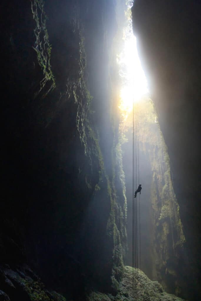 你将进行 35 米高空速降,乘滑索穿越萤火虫穹顶,攀爬地下瀑布,并钻过狭窄通道。需要良好体能与勇气!